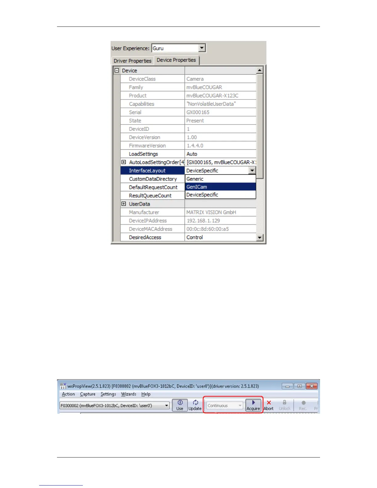 Start the wxPropView (p. 74) and initialize the device by clicking "Use" and start a "Continuous" acquisition.