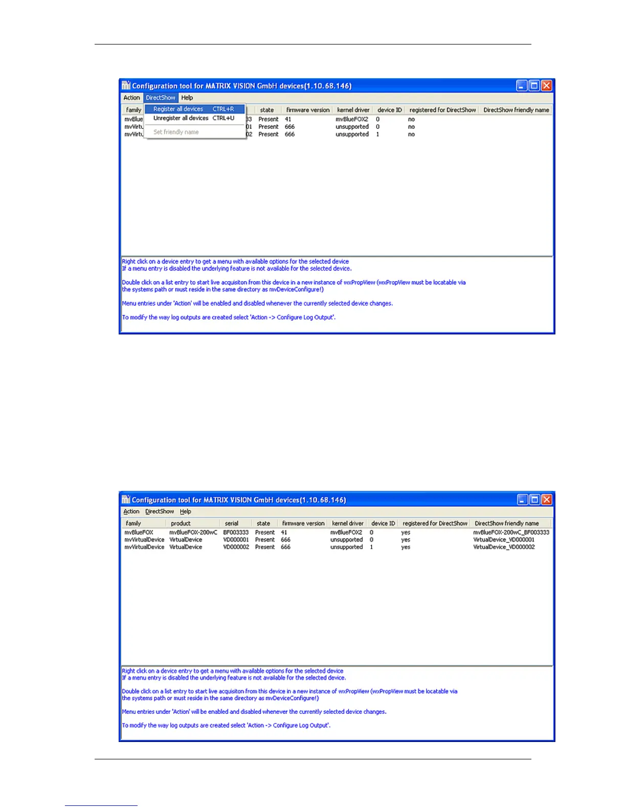 3. After a successful registration the column "registered for DirectShow" will display 'yes' for every device and