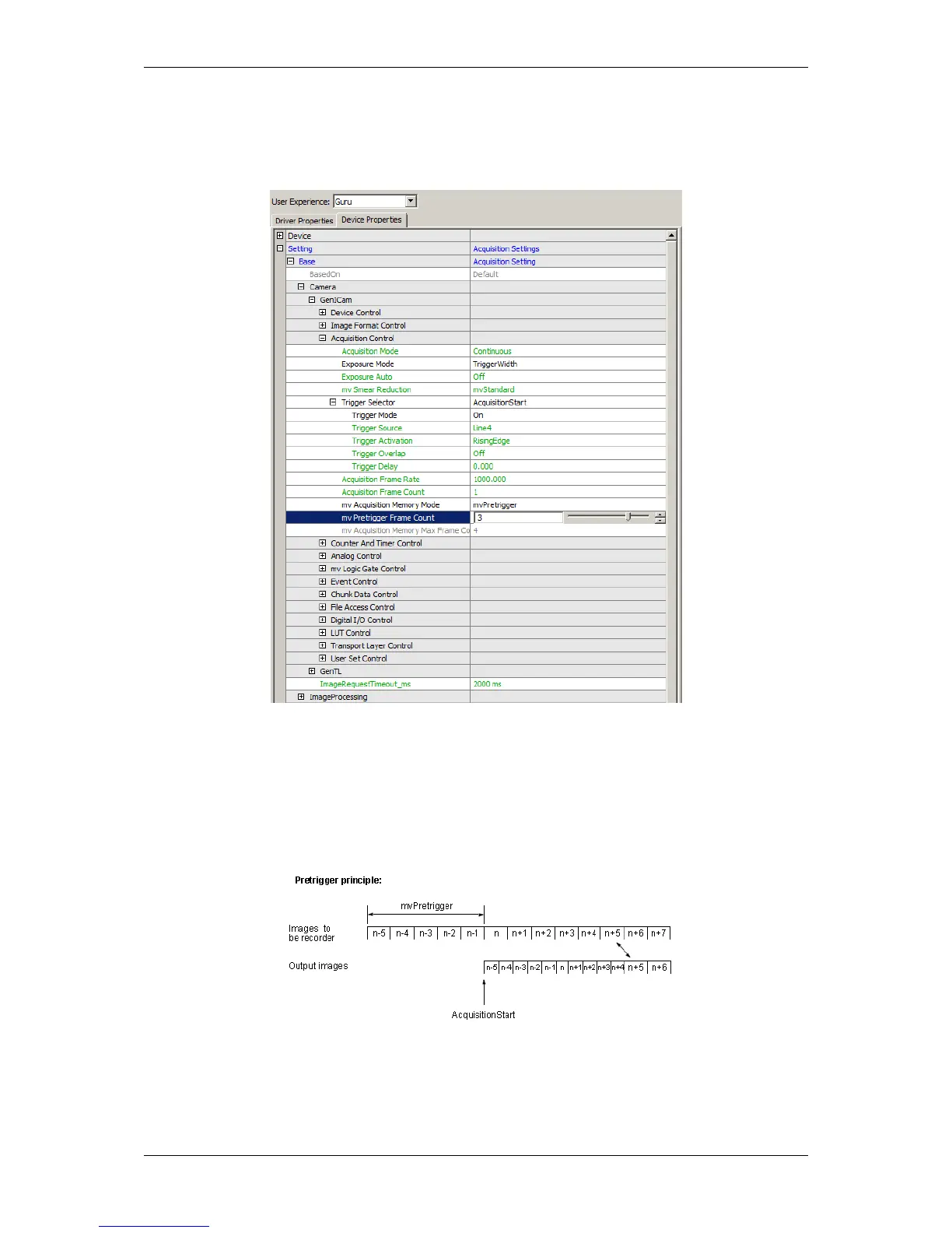 To use this functionality you have to set the mv Acquisition Memory Mode (p. 109) to "mvPretrigger". This can