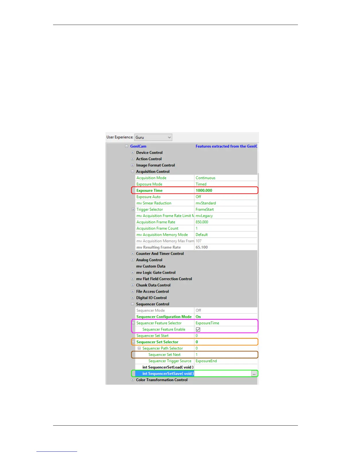 2. Set the "Sequencer Feature Selector", if it is not already active (pink box, figure 3): "Sequencer Feature
