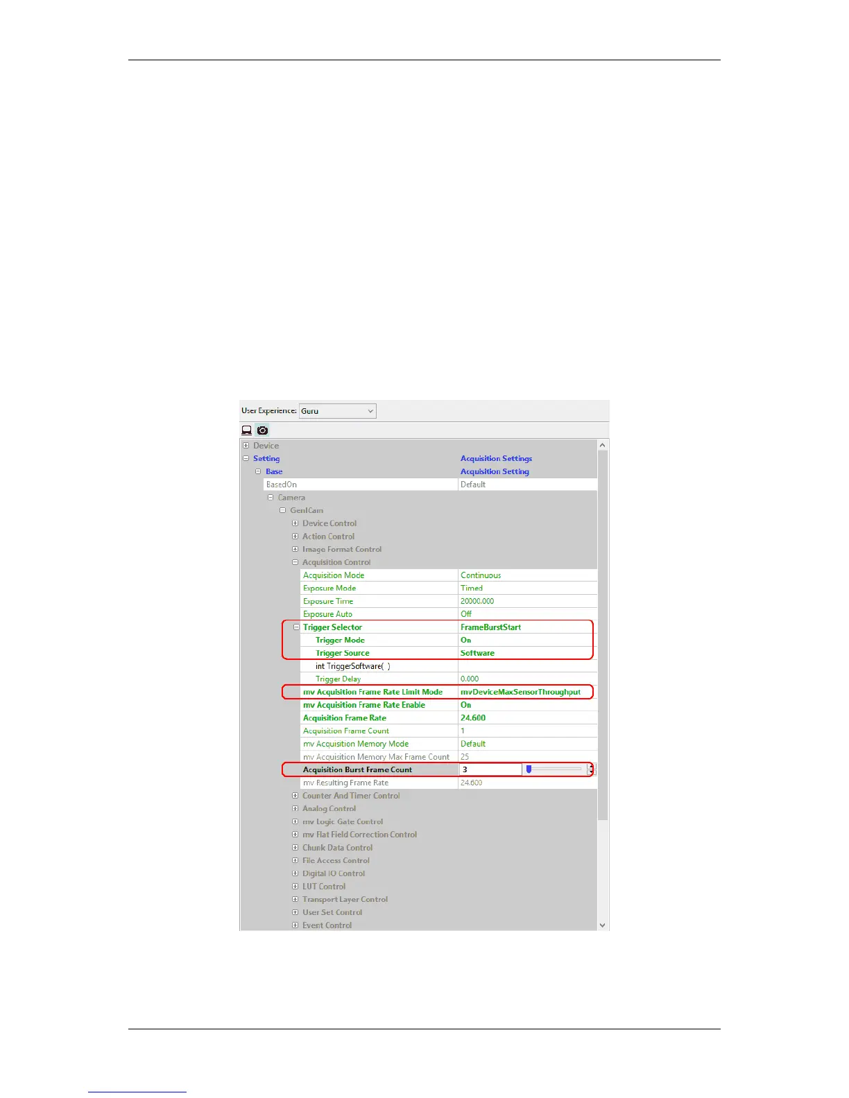 With the triggerSelector "FrameBurstStart", you can also start a frame burst acquisition by a trigger. A defined