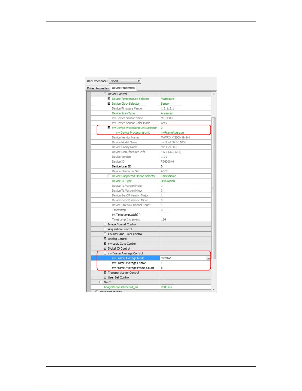 7. Activate frame averaging by setting "mv Frame Average Frame Enable = 1".