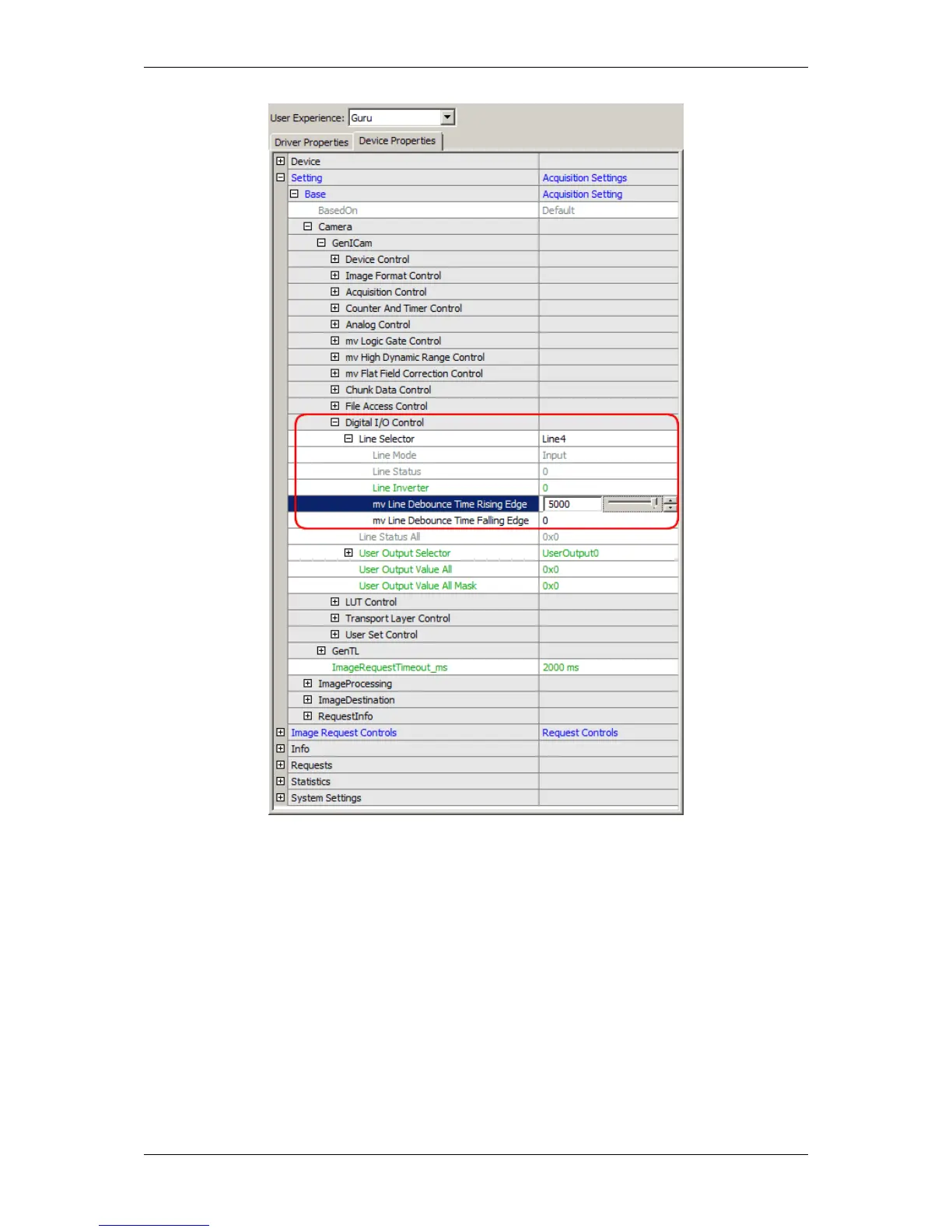 property to configure the debouncing time for falling edge trigger signals (mvLineDebounceTimeFallingEdge) and