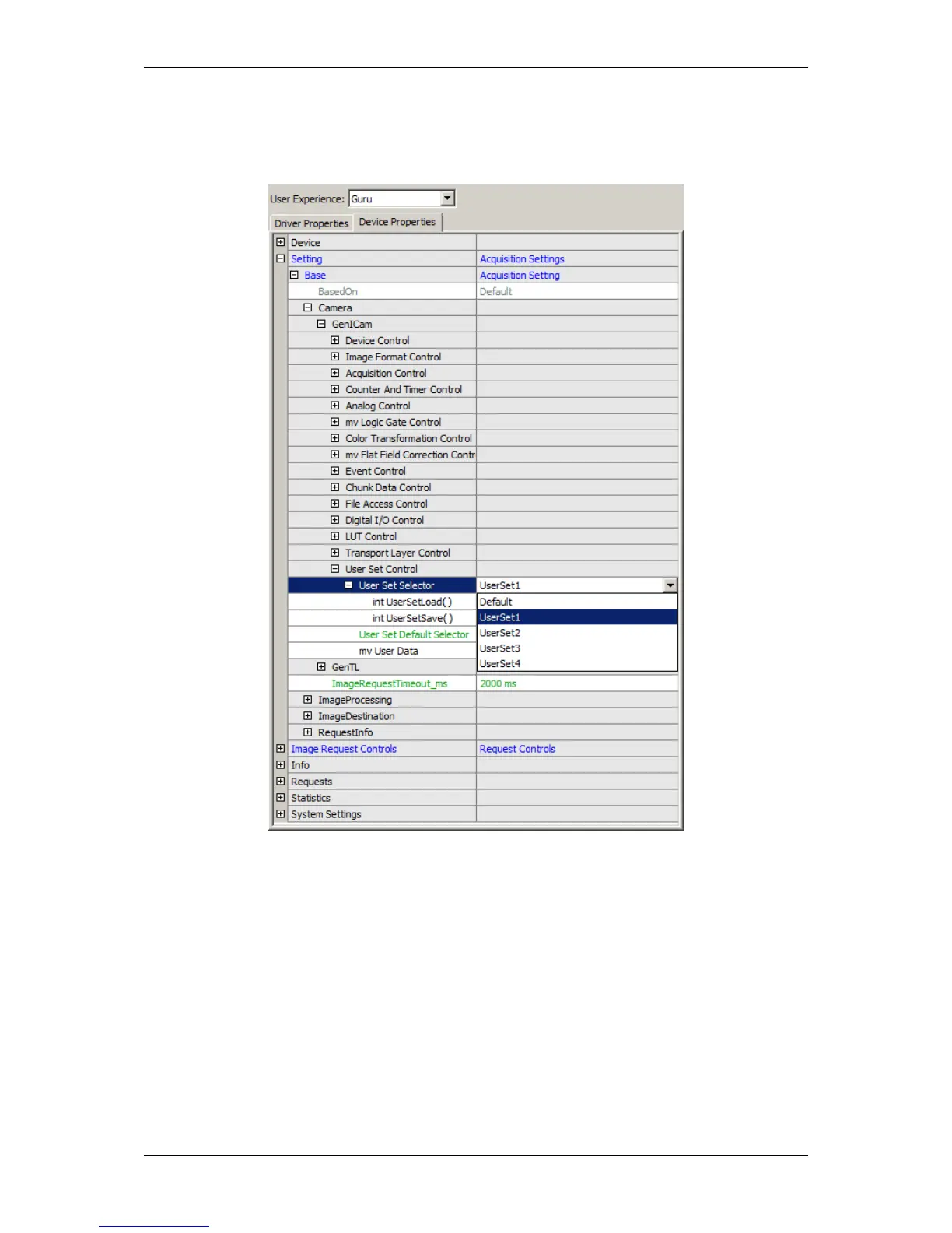 With "User Set Selector" you can select the user set ("Default", "UserSet1 - UserSet4"). To save or load the specific
