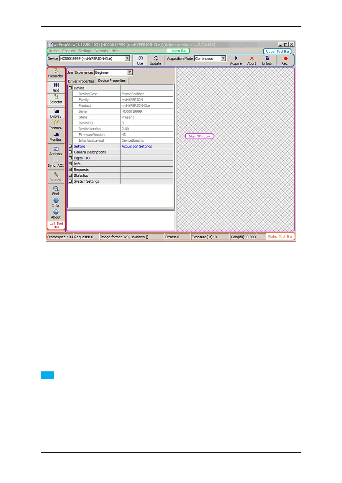 Now, you can capture an image ("Acquisition Mode": "SingleFrame") or display live images ("Continuous"). Just