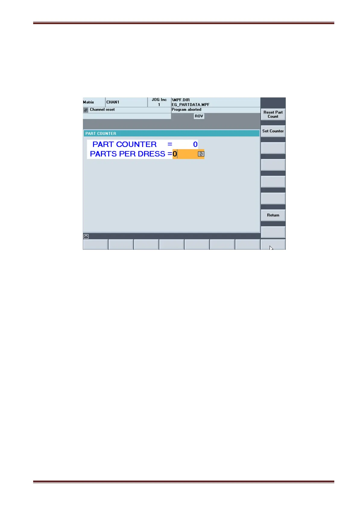 Select this soft key to enter values to the Part Counter and Parts Per Dress input fields.