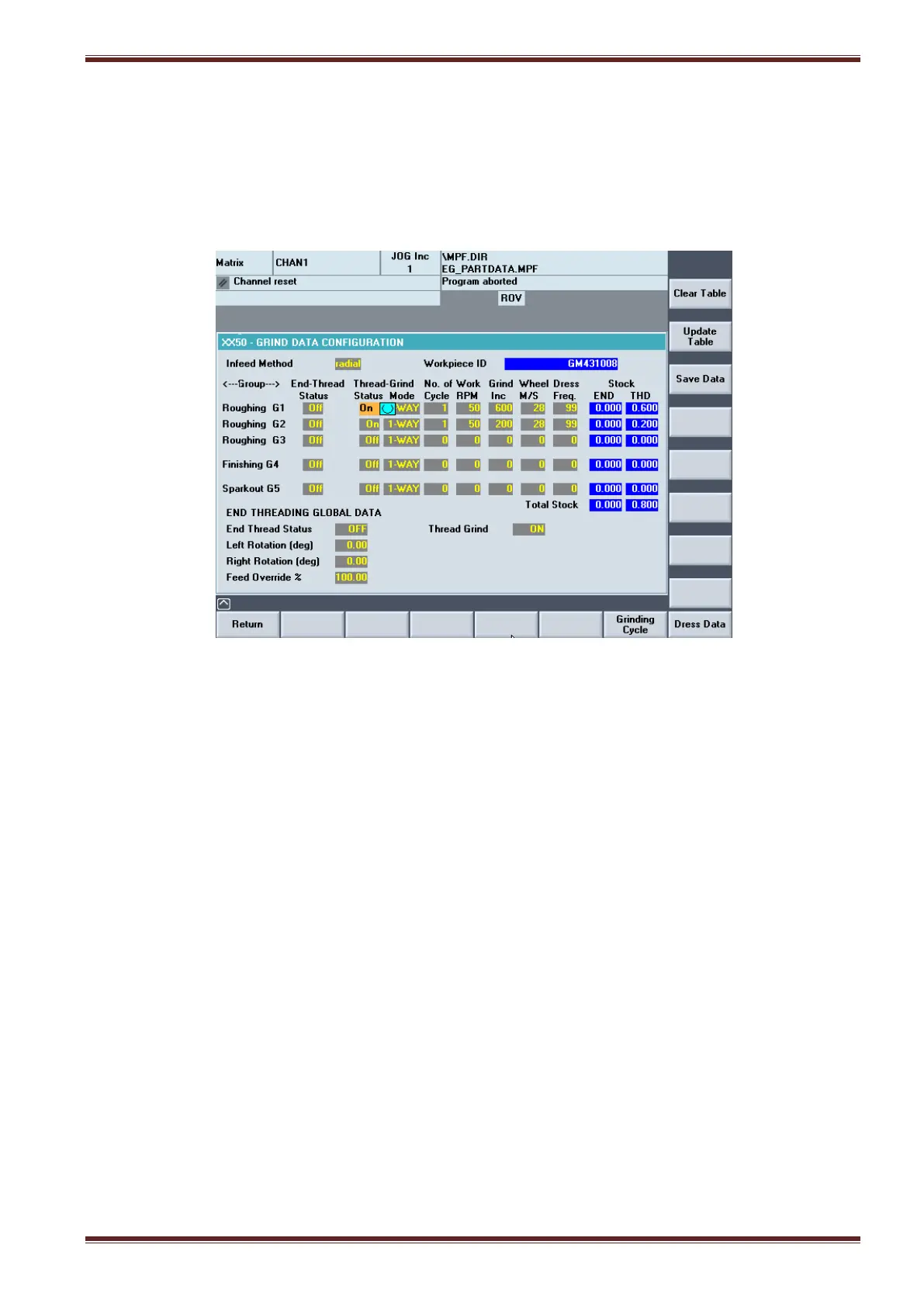 dressing interval between grinding passes is defined in this screen.