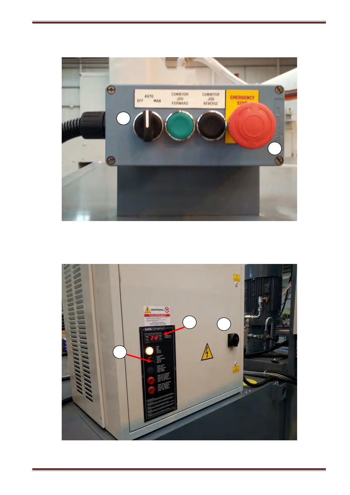 4. Reset the emergency stop button (4) at the swarf conveyor control panel.