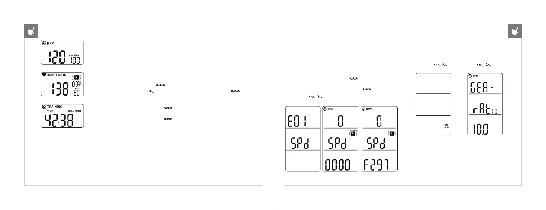 • The top display (RPM) shows Cadence in RPM, average RPM and Low battery indicator. Cadence in RPM is the