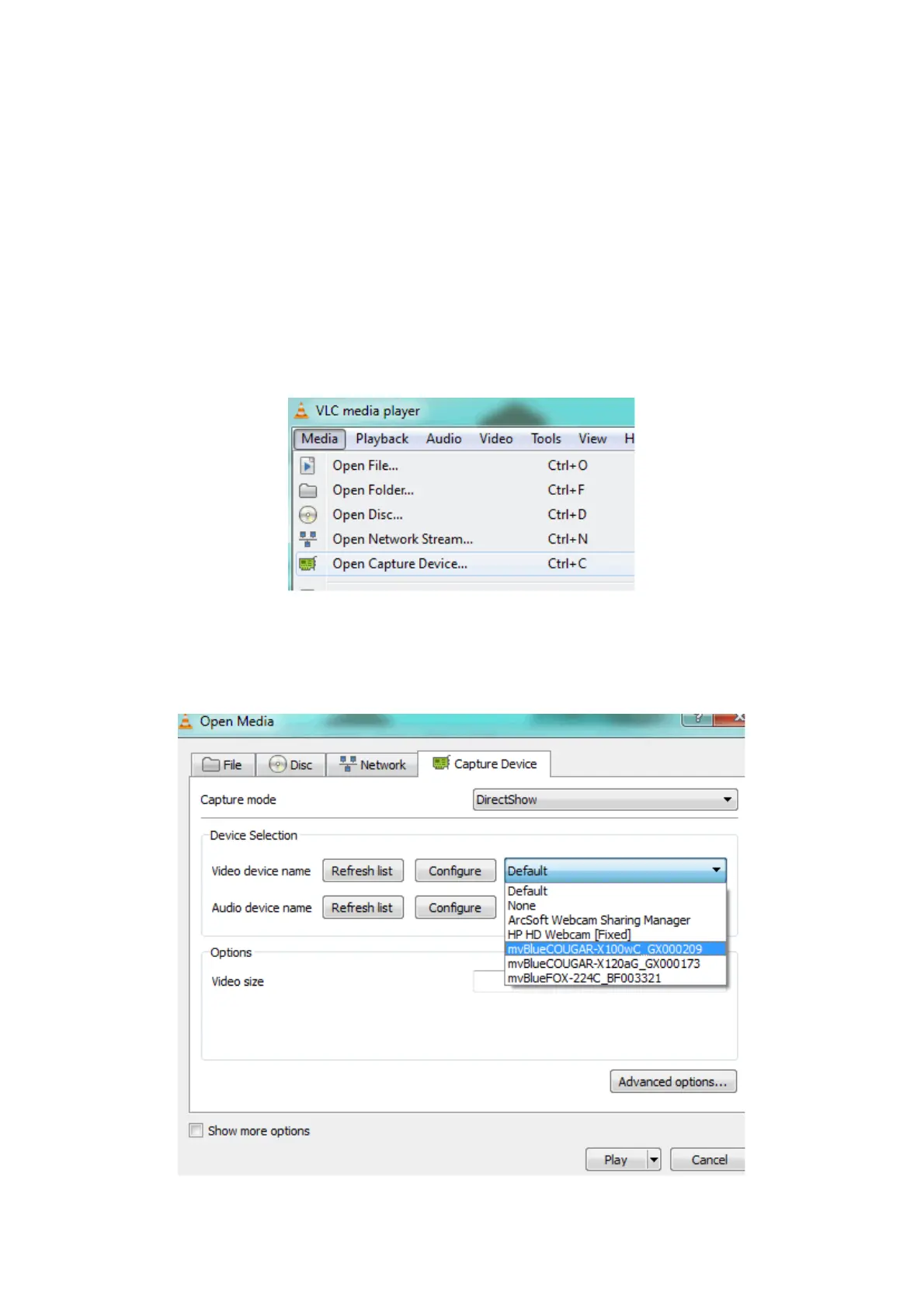 Click on "Media -> Open Capture Device..." .