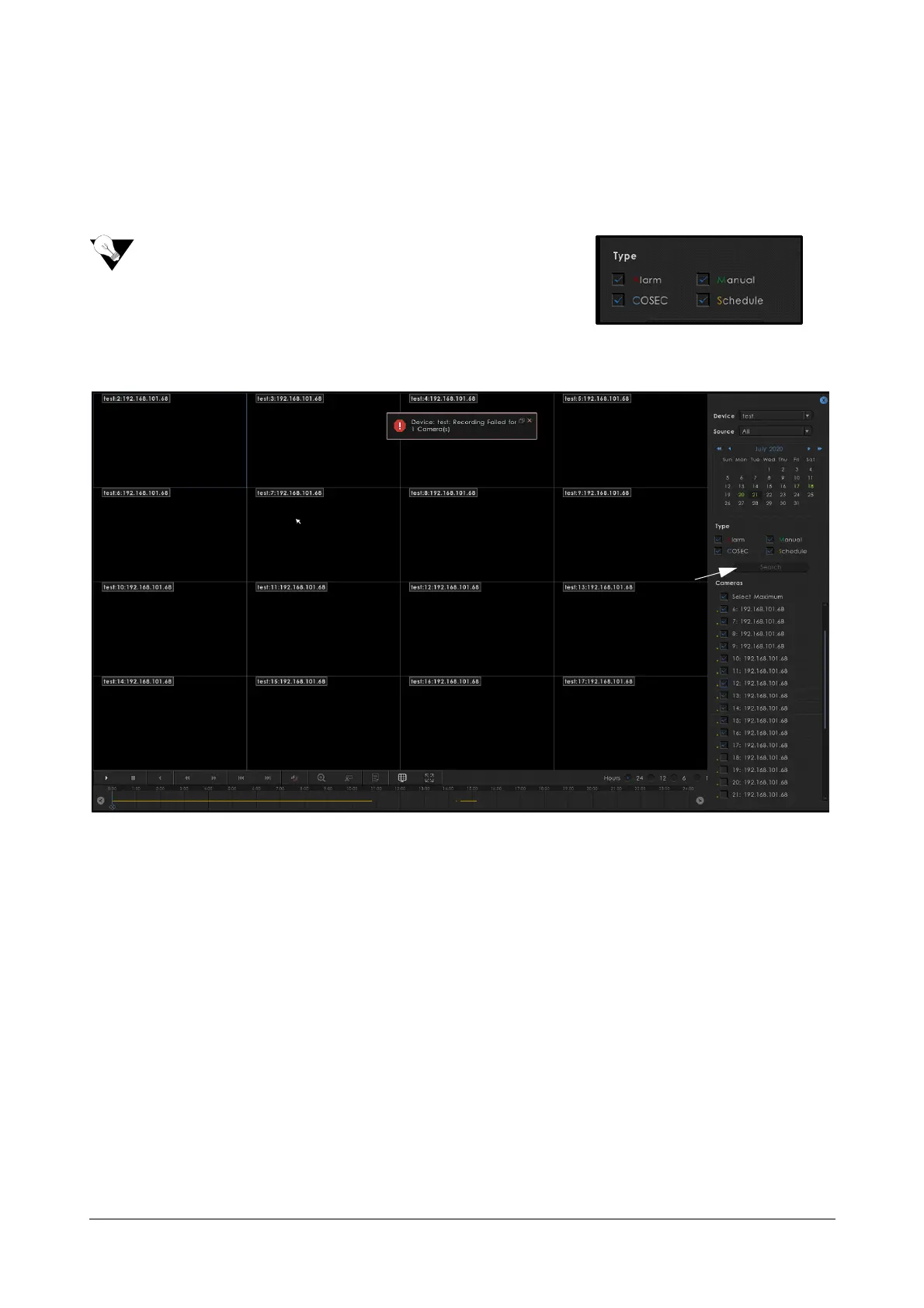 The colored dot (.) besides the camera check box indicates the type of recording available in respective camera. If