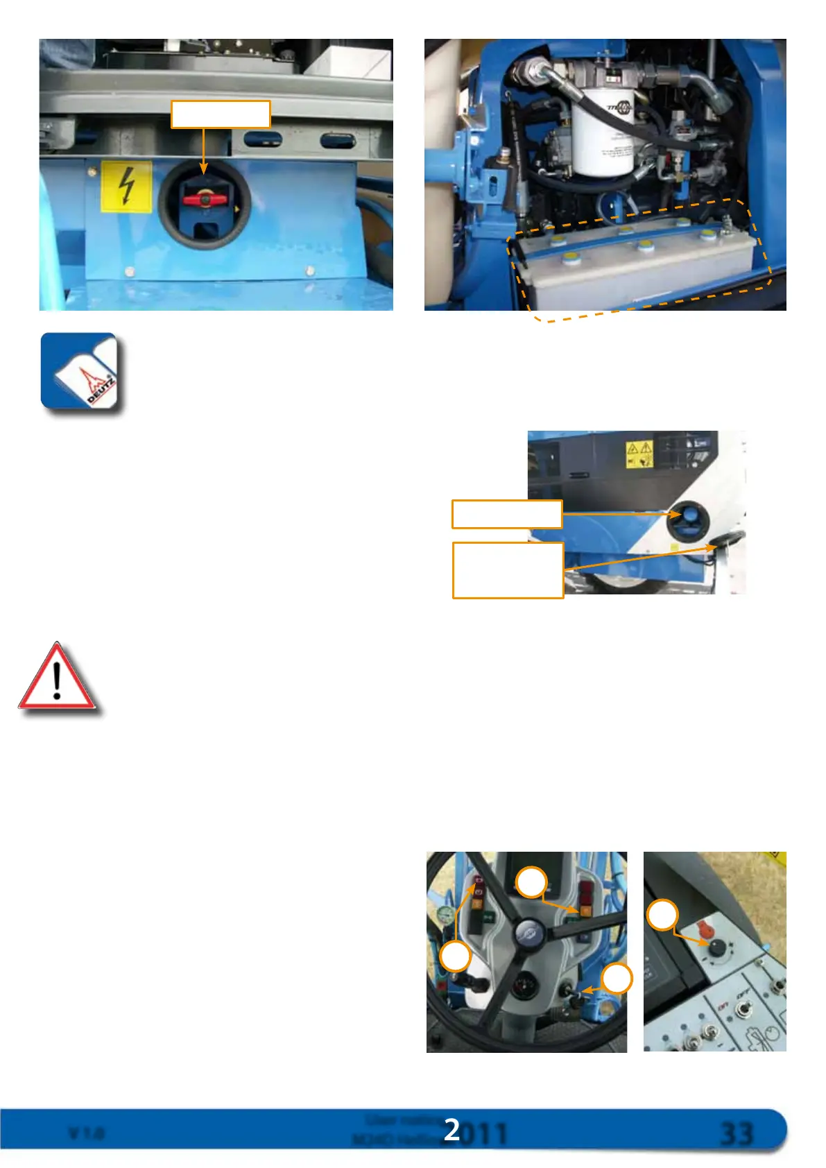 ◦After ensuring that the cutout switch is activated, check the level of electrolyte in the battery.