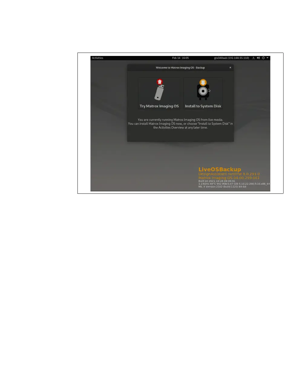 5. After selecting to boot from the backup MISO ISO, the Matrox Imaging OS -