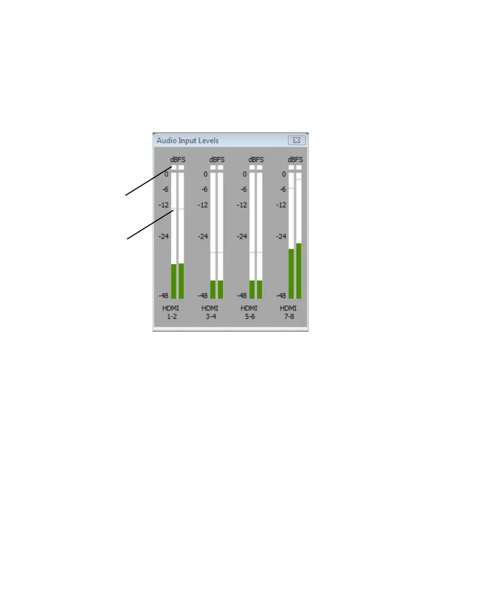 –12 dBSF, yellow between –12 and –6 dBFS, and red above –6 dBFS. The