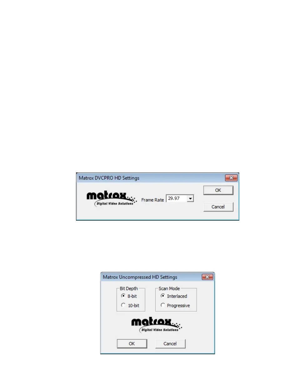 When you choose to configure the Matrox DVCPRO HD codec, a dialog box