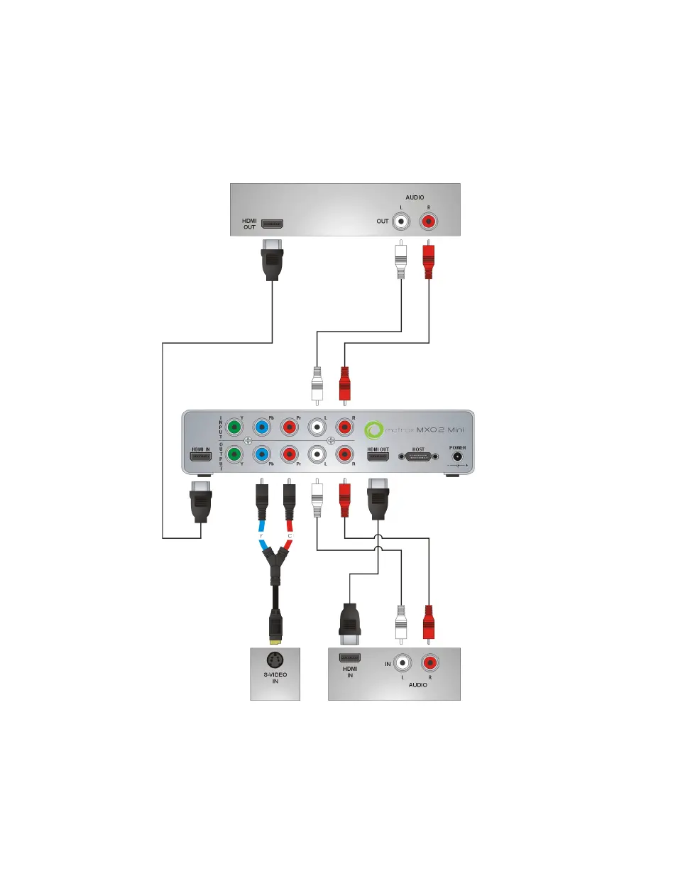 In this illustration, we’re using HDMI for video, RCA connectors for audio, and