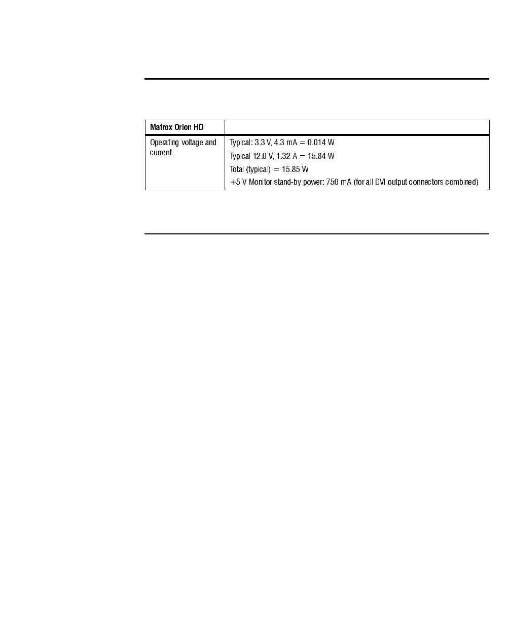 The following table shows the Matrox Orion HD board’s electrical specifications.