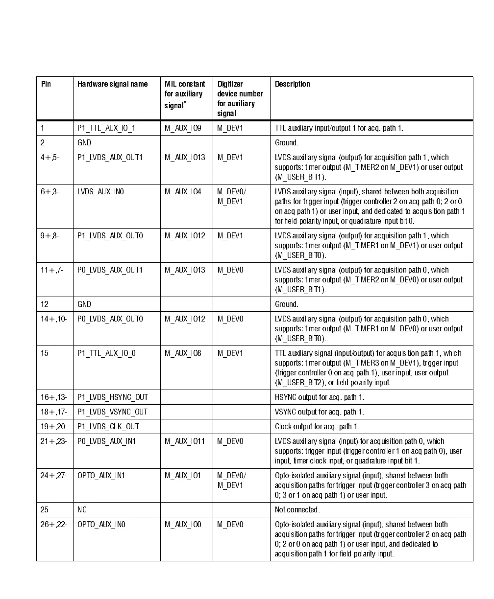 9+,8- P1_LVDS_AUX_OUT0 M_AUX_IO12 M_DEV1 LVDS auxiliary signal (output) for acquisition path 1, which