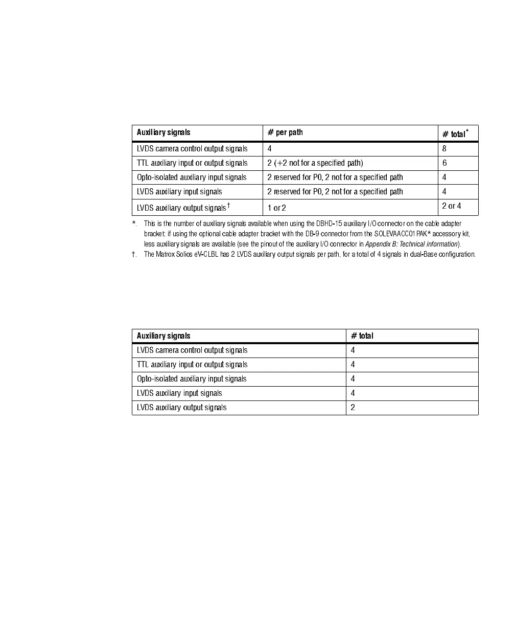 †. The Matrox Solios eV-CLBL has 2 LVDS auxiliary output signals per path, for a total of 4 signals in dual-Base configuration.