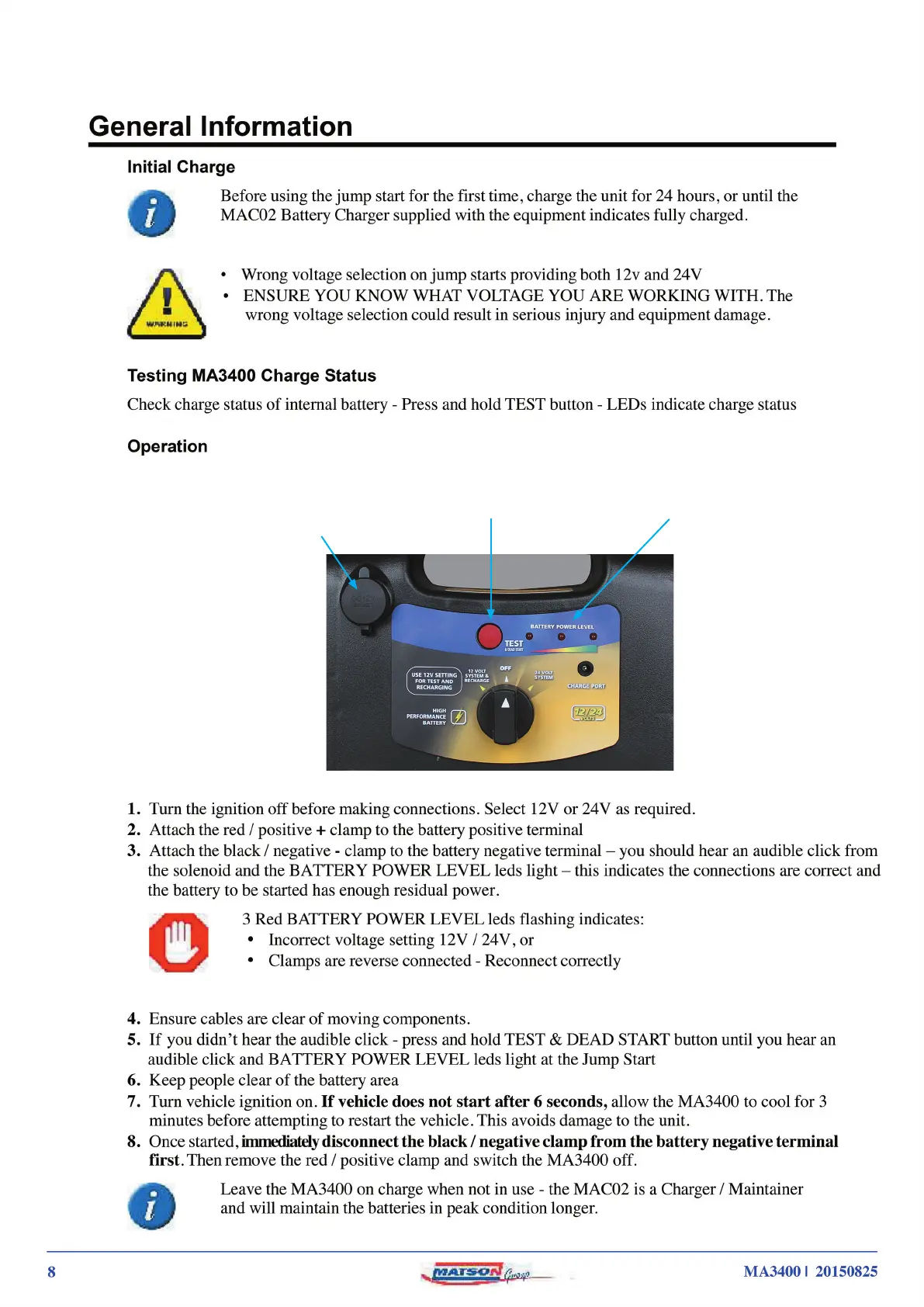 matson MA3400 - MA3400 Operation and Charging; Initial Charge; Charge Status Testing; Operating Instructions
