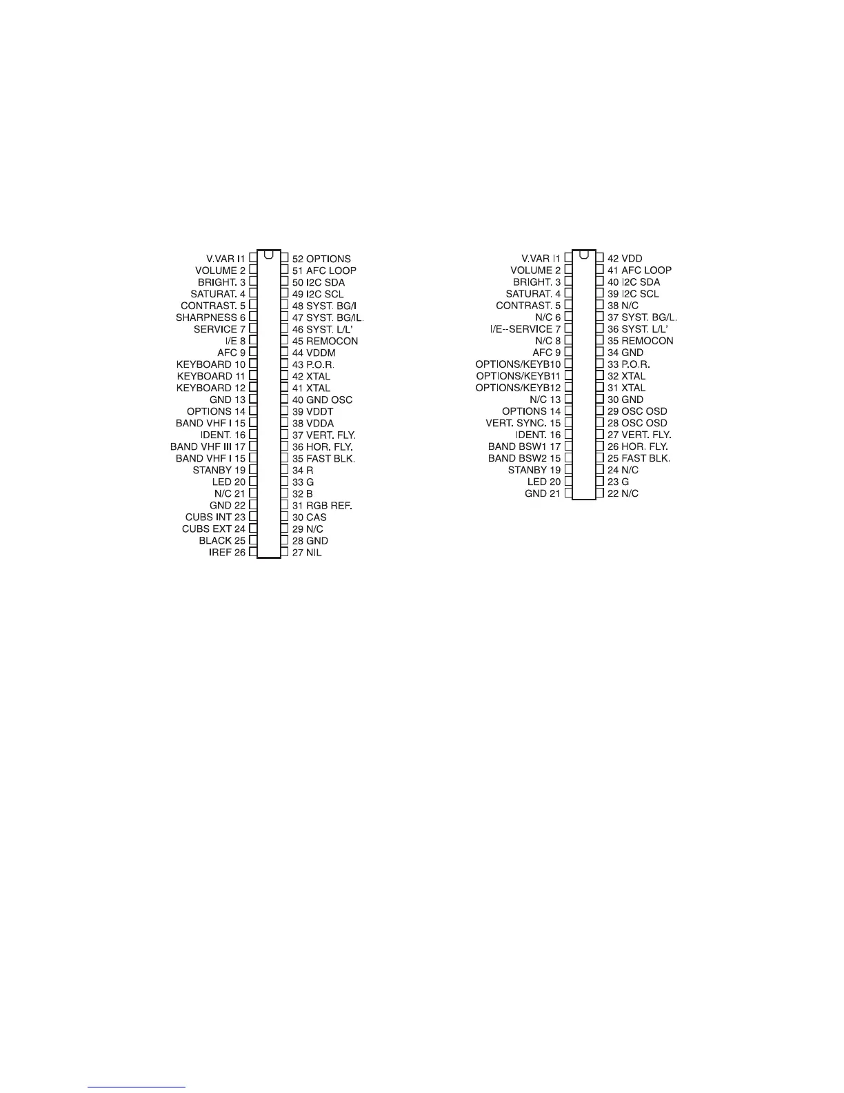 The three microcontrollers are mounted in the same position, by placing pin 1 at the same point. The TMP47C634 has 42 pins while the SAA52XX