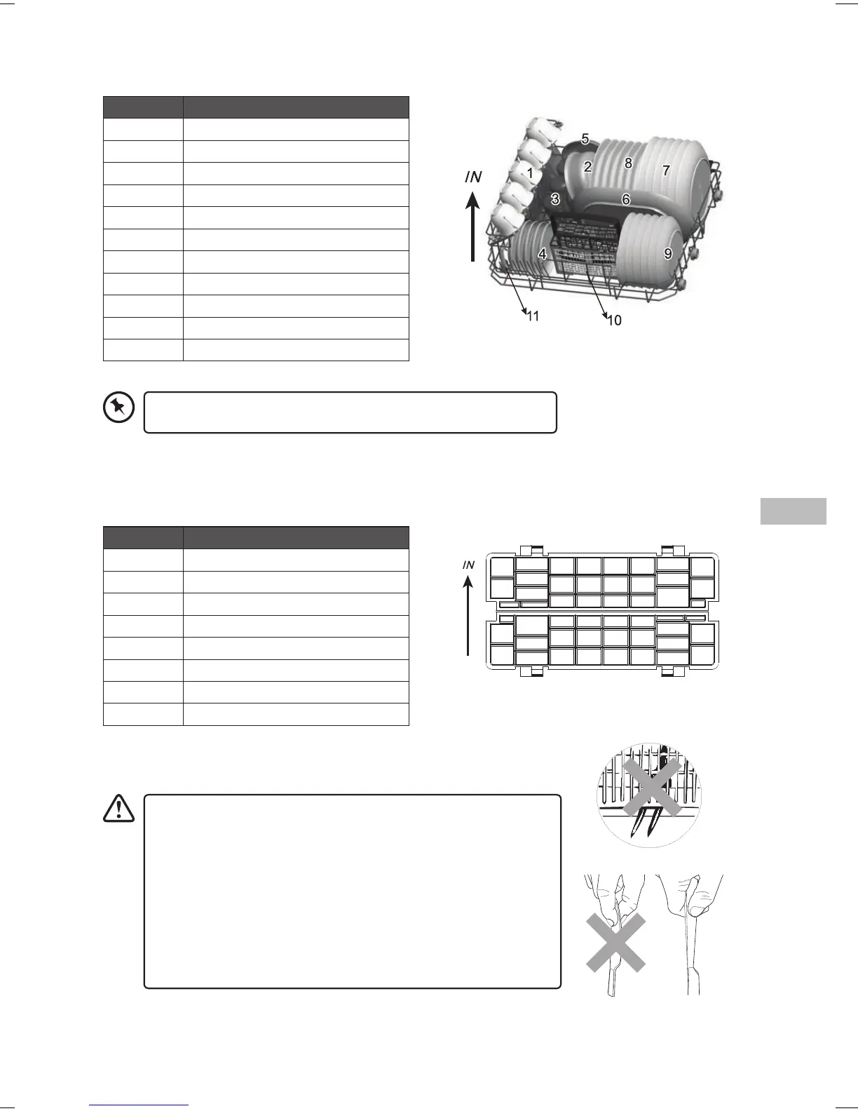 Katso seuraavasta luettelosta ja kuvasta astioiden optimaalinen sijoittaminen astianpesukoneen alakoriin.
