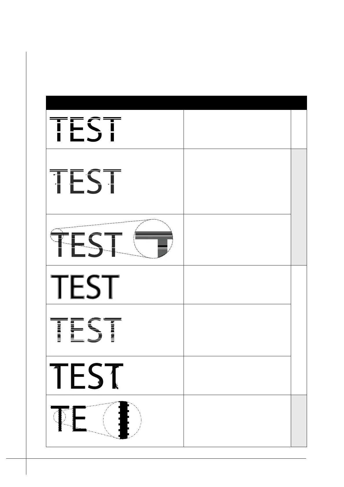Provided below is a list of poor print quality examples. The possible cause for the poor print