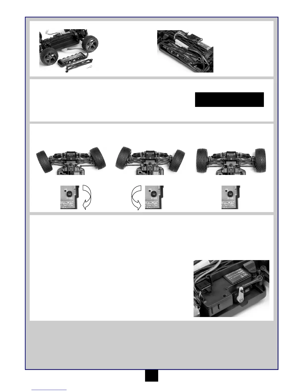 If the front tyres are not pointing straight forward with the transmitter on, adjust the steering trim. Then if needed make fine adjustments with the
