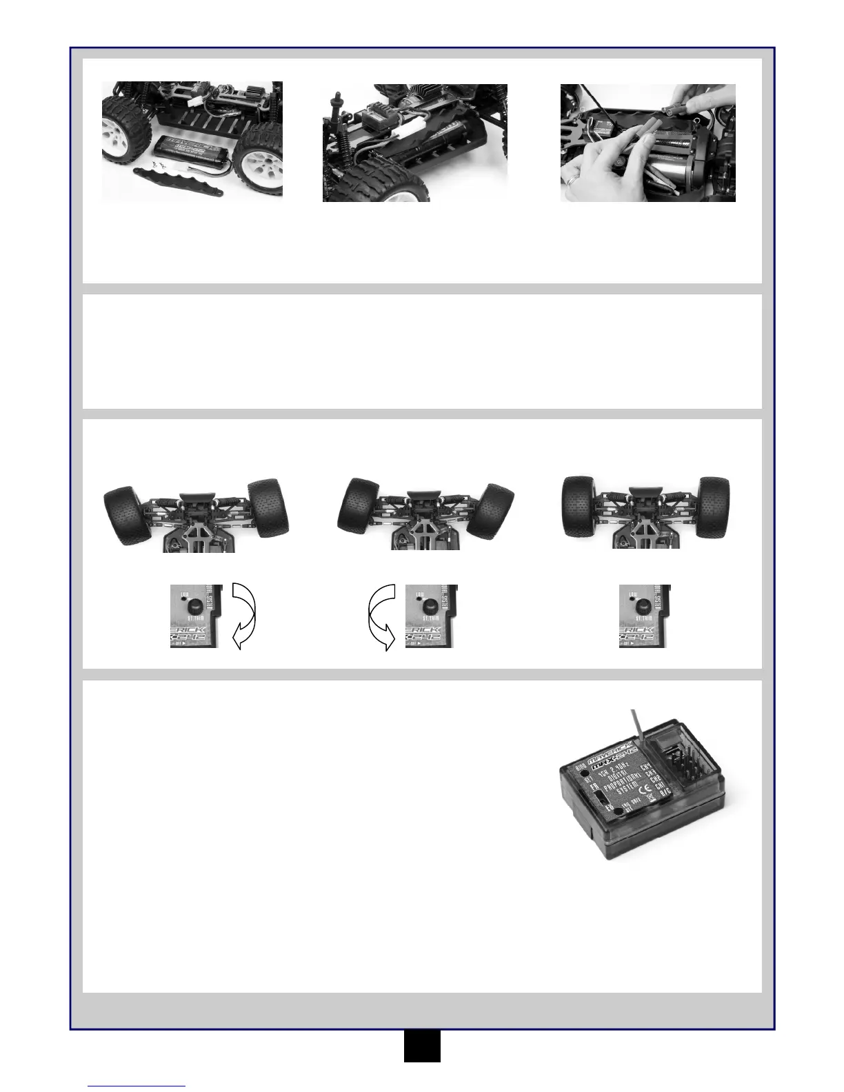 Wenn bei eingeschaltetem Sender die Vorderräder nicht genau geradeaus weisen, korrigieren Sie dies mit der Lenkungstrimmung.