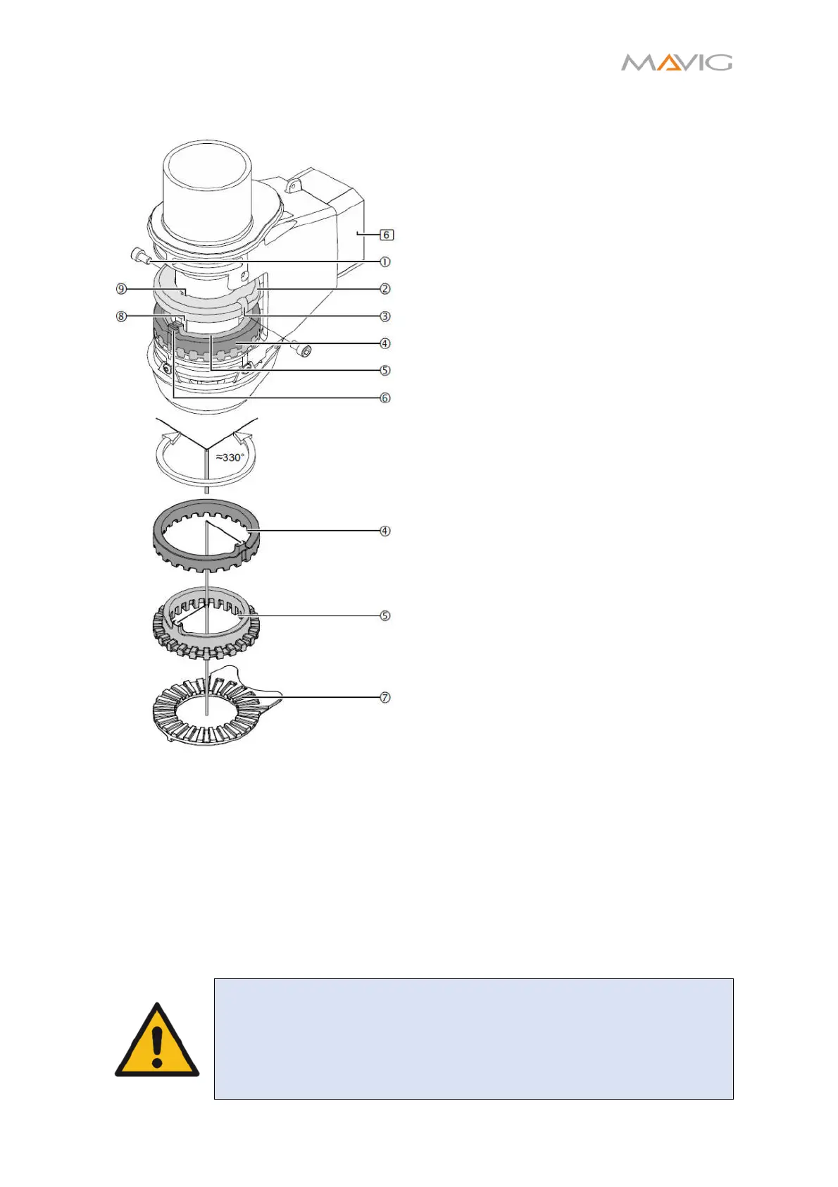end-stop ring ② into the two fit-in keys ⑧ and lower the end-stop ring ②.