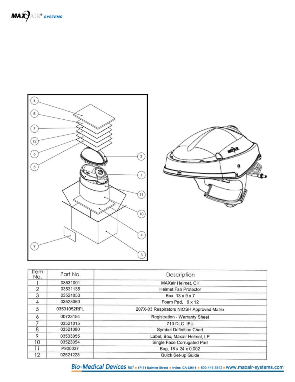 Carefully unpack the 2070-03 MAXAIR CAPR Helmet from the shipping box. Verify there are no missing or loose components