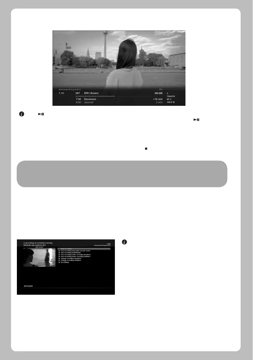 In this state, Timeshifted recording is running until you press either PLAY or PAUSE again. You can restart viewing of the program.