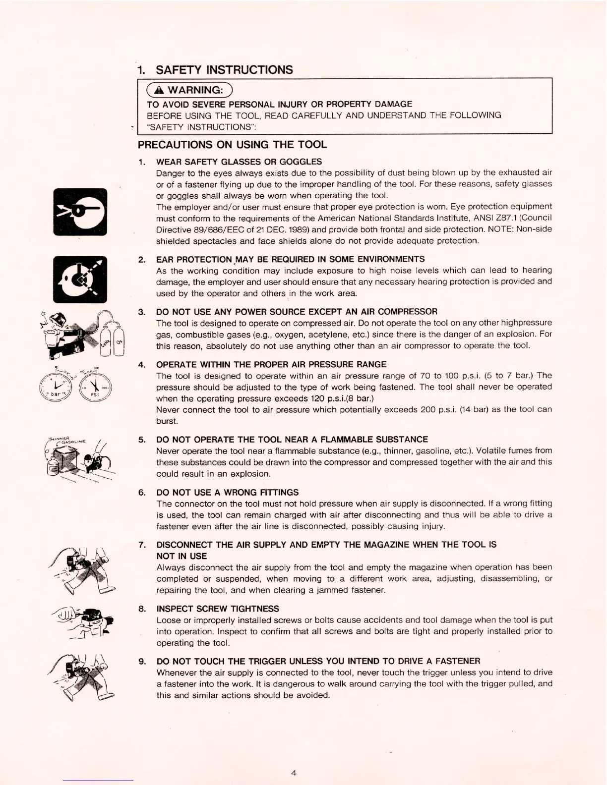 Max CN80 - Safety Instructions; Wear Safety Glasses or Goggles; Air Supply Safety and Operation; Tool Handling and Trigger Safety