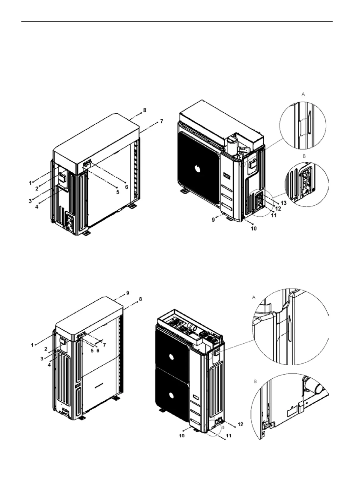 4. Uncrew the screws (number 8; 9 visible in detail B) and those on the coil side of the unit. To remove the side panel, pull it upwards (to free