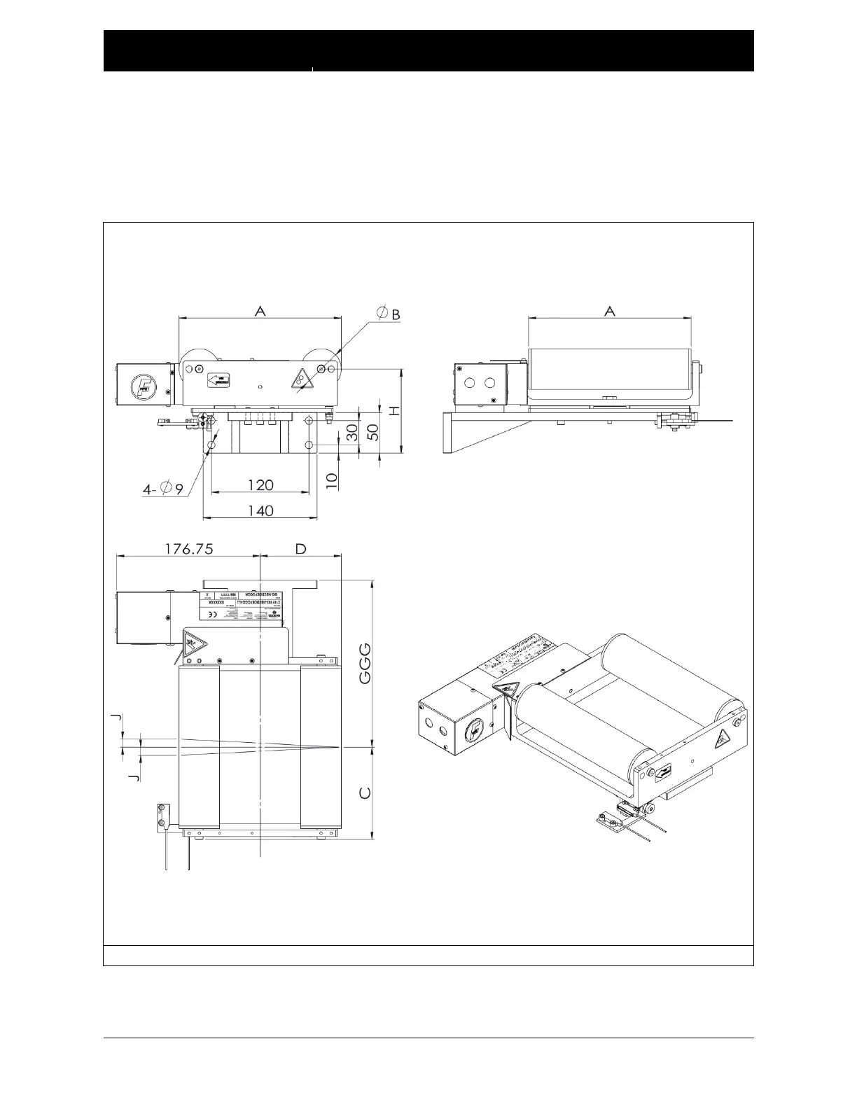 Mount the guide(s) in the web path on a rigid support frame using four M8 bolts through the