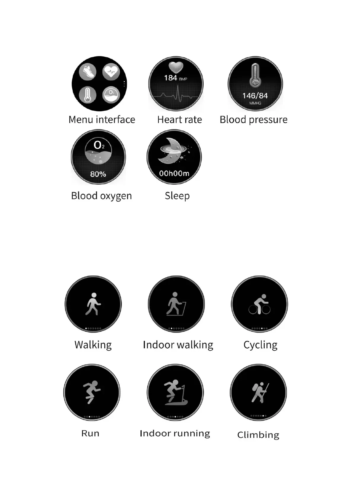 (1) Sport Modes: Walking, Walking indoor, Running, Running indoor, Cycling and