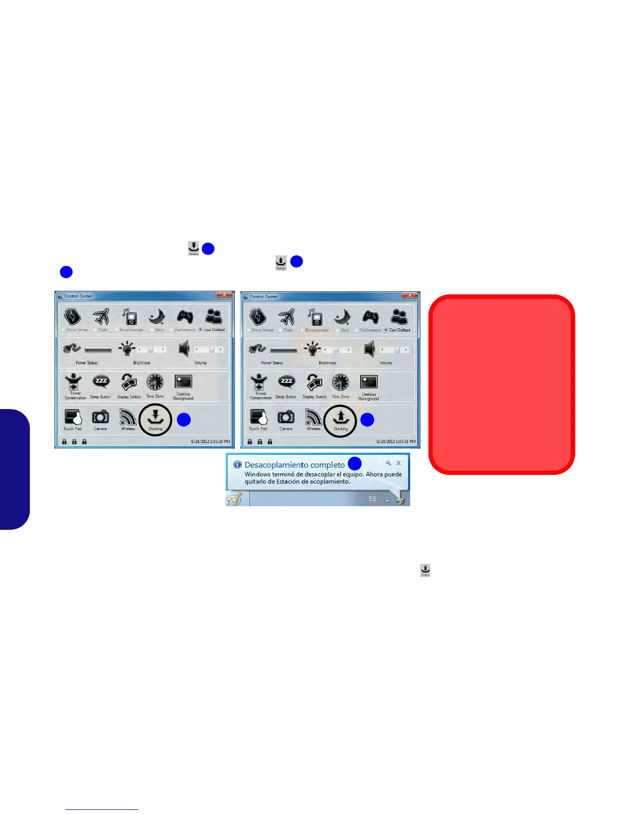 7. Si no desea separar el portátil de la estación soporte en este punto puede hacer clic en el icono del Centro de control para volver a