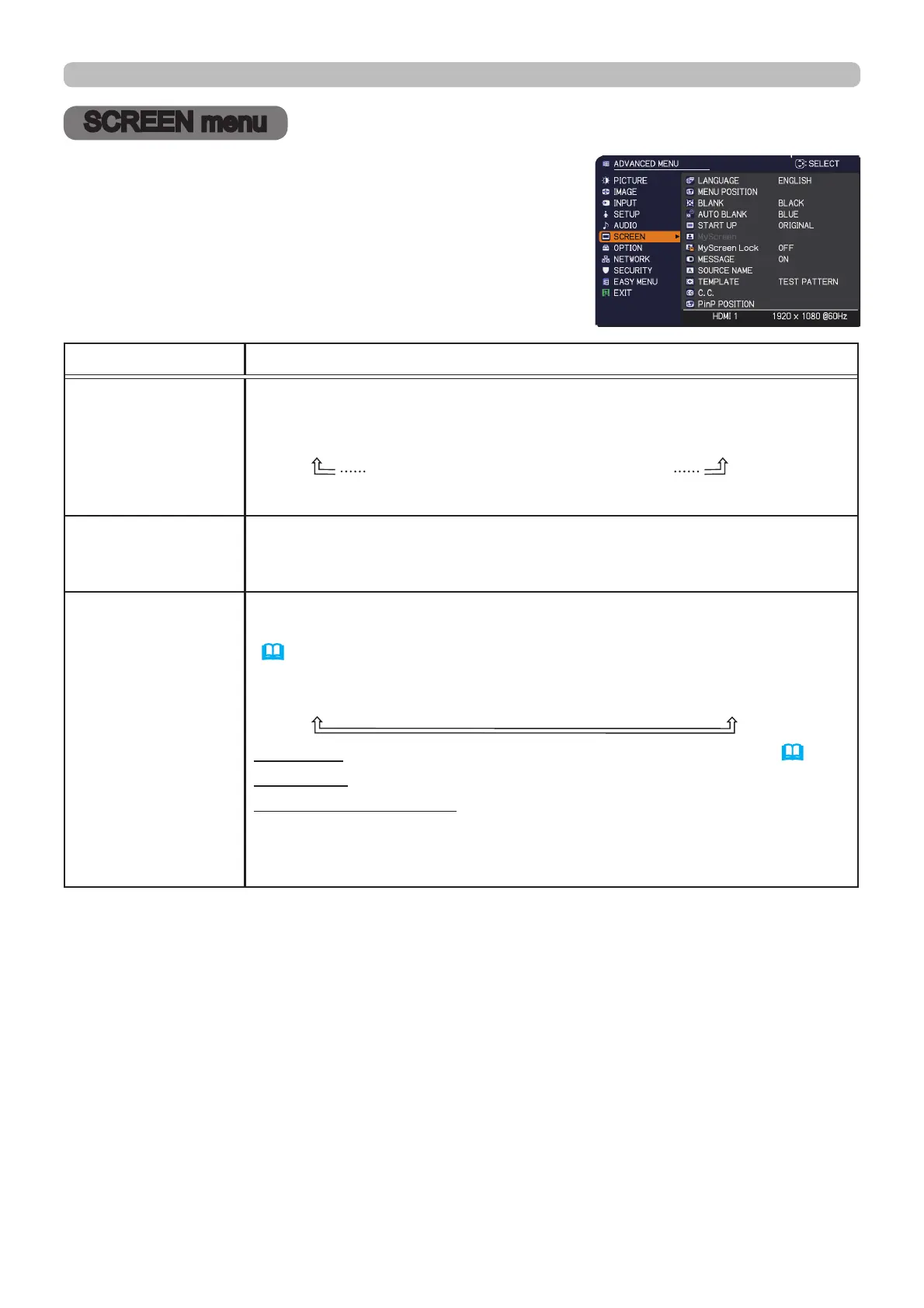 SCREEN menu