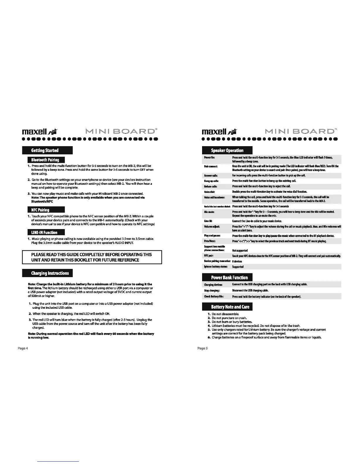 Maxell Mini Board MB-2 - Getting Started; Bluetooth Pairing; NFC Pairing; LINE-IN Function