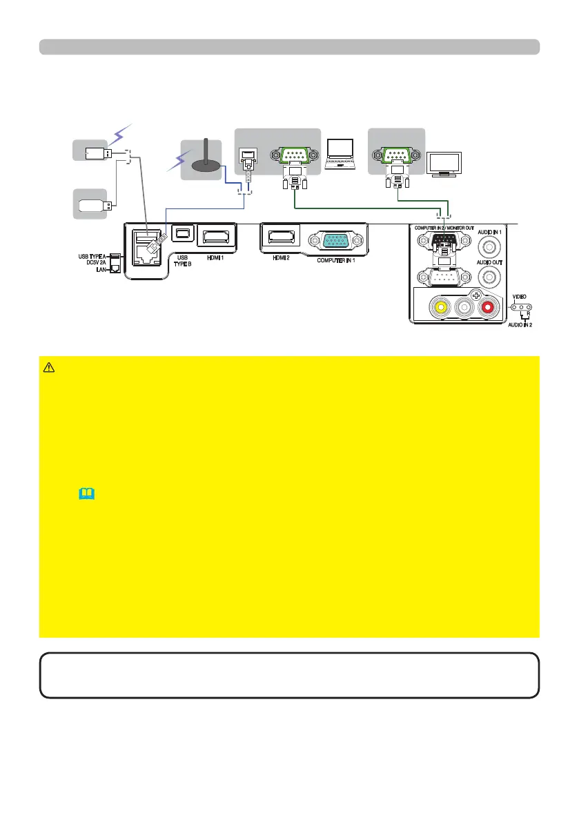 ►To connect both the LAN cable and USB device to the projector, use a LAN