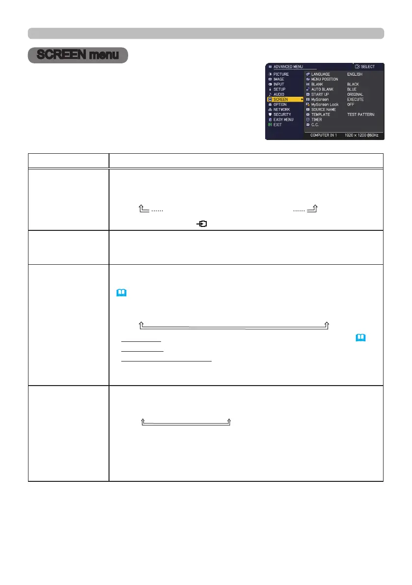 From the SCREEN menu, items shown in the table