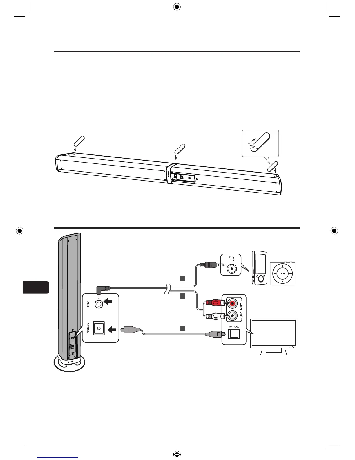 3. Přilepte gumové patky na spodní část zařízení tak, jak vidíte na obrázku níže.
