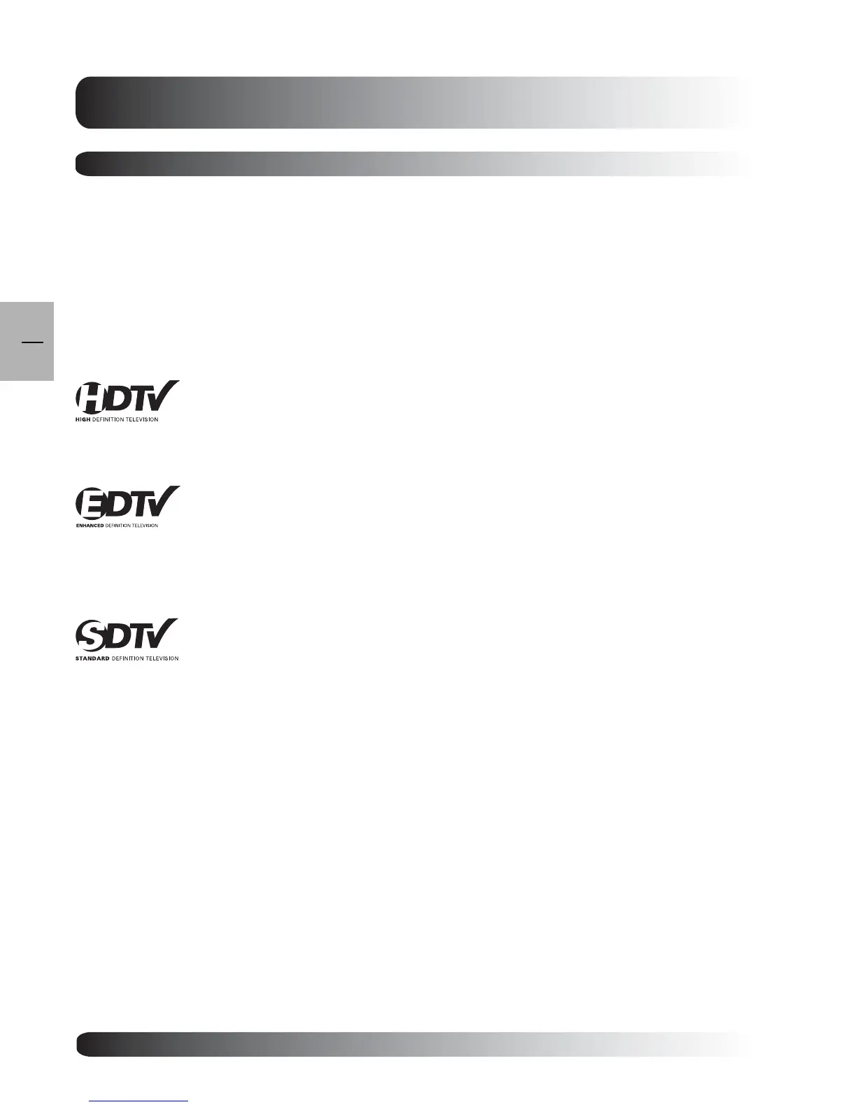 three following categories: HDTV (High Definition TV), EDTV (Enhanced Digital TV), and SDTV (Standard