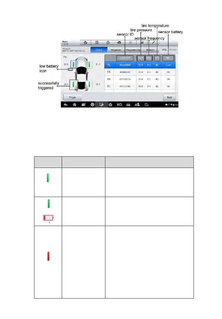The sensor position, sensor ID, tire pressure, tire temperature, sensor