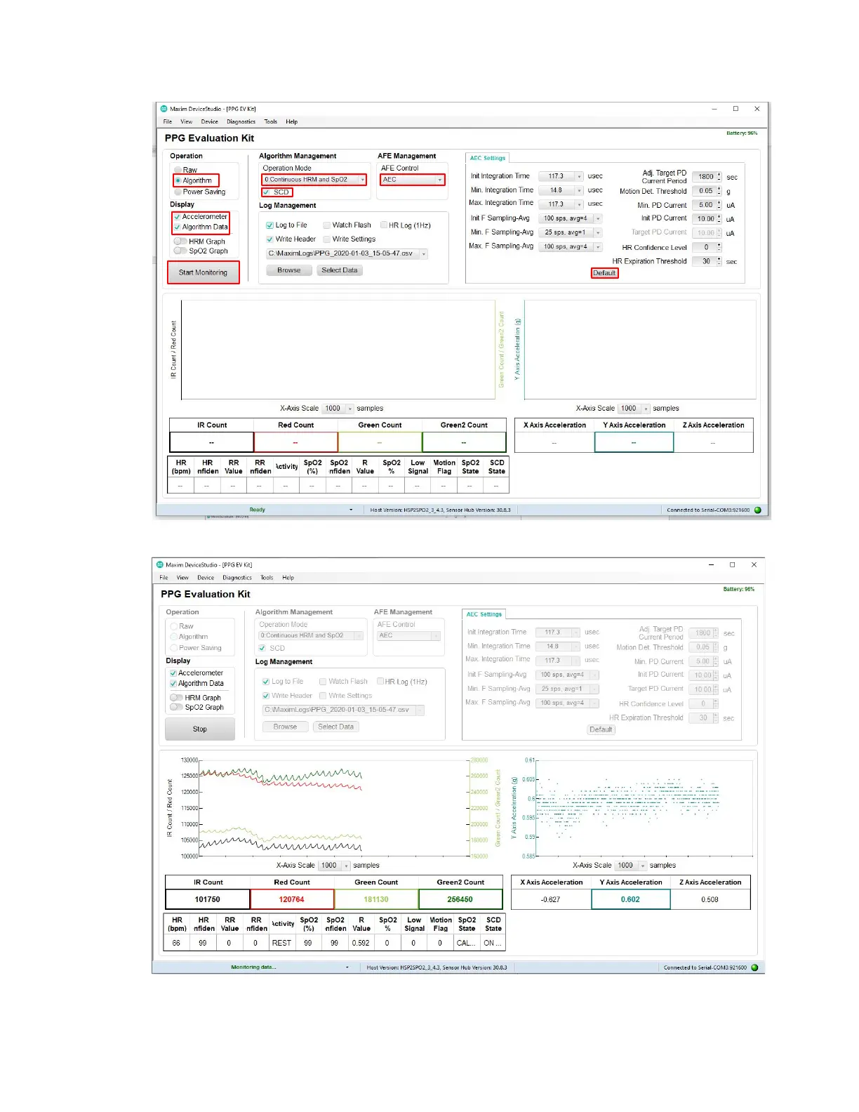 Maxim Integrated MAXREFDES103 - Figure 27. Configure for Algorithm Mode; Figure 28. Measurement Data Displayed