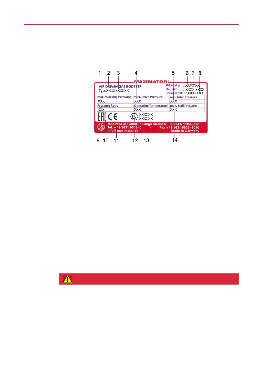 The rating plate is located on the drive cylinder of the gas booster and contains