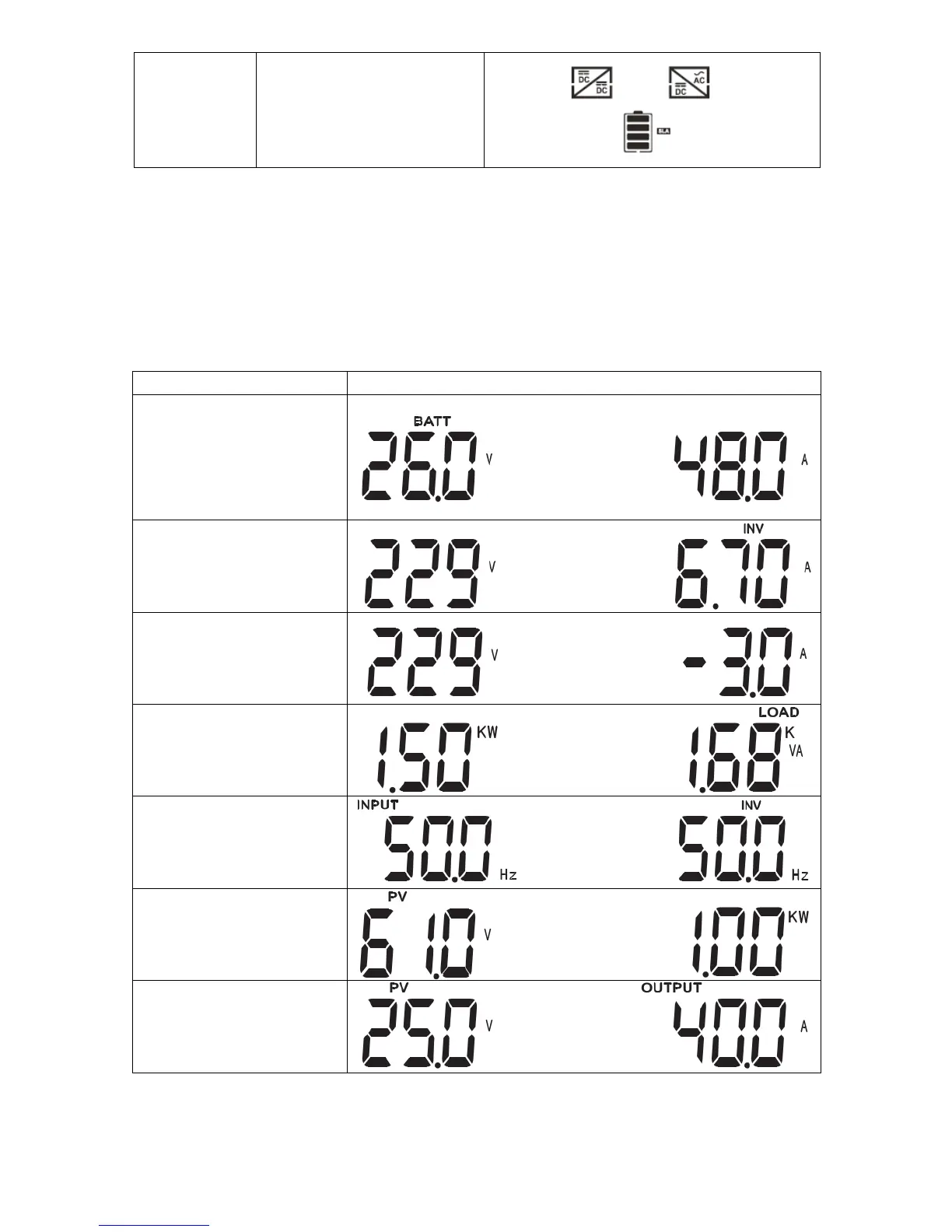 information is switched as below order: battery voltage, battery current, inverter voltage, inverter current, AC