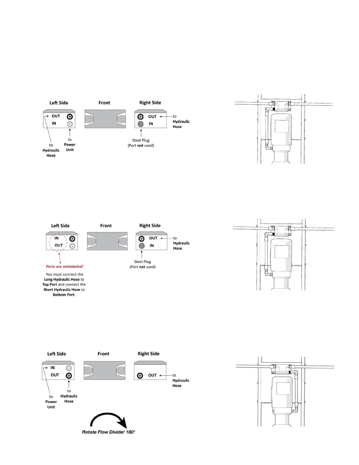 If your Flow Divider looks like the graphic below, the Left side Ports are mislabeled. Do not connect the Short