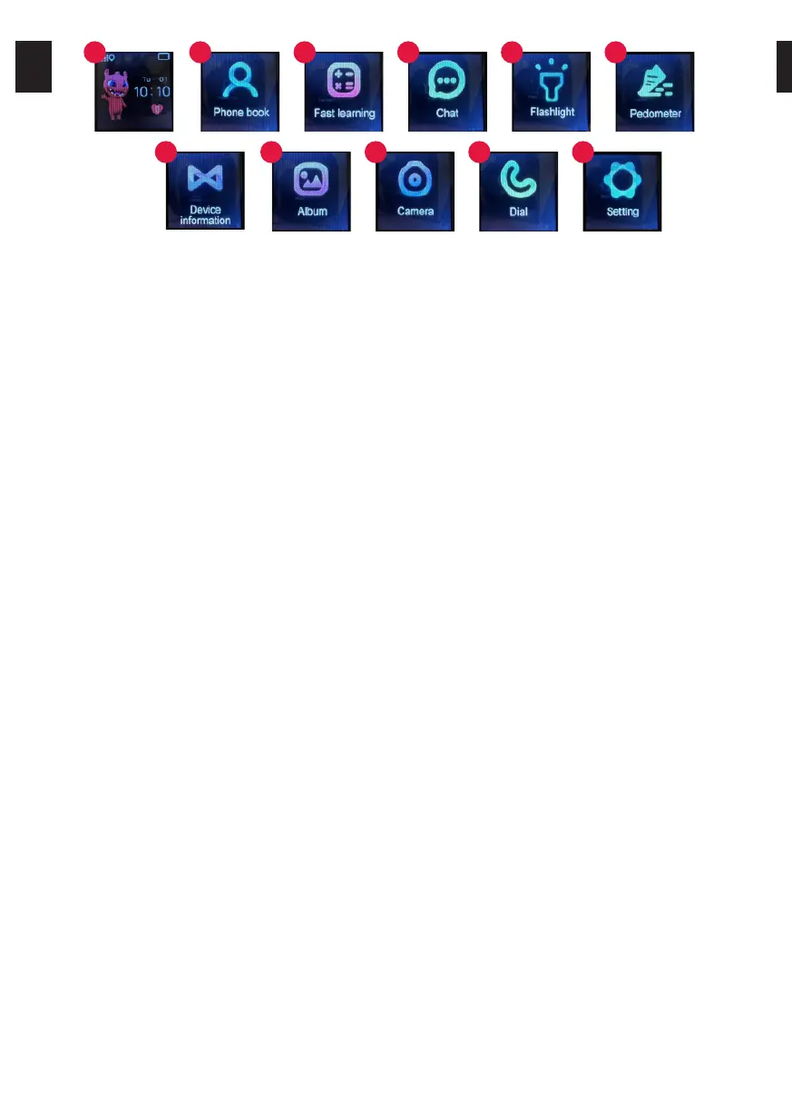 1. The main screen of the watch, showing the current date and time, battery level, icon