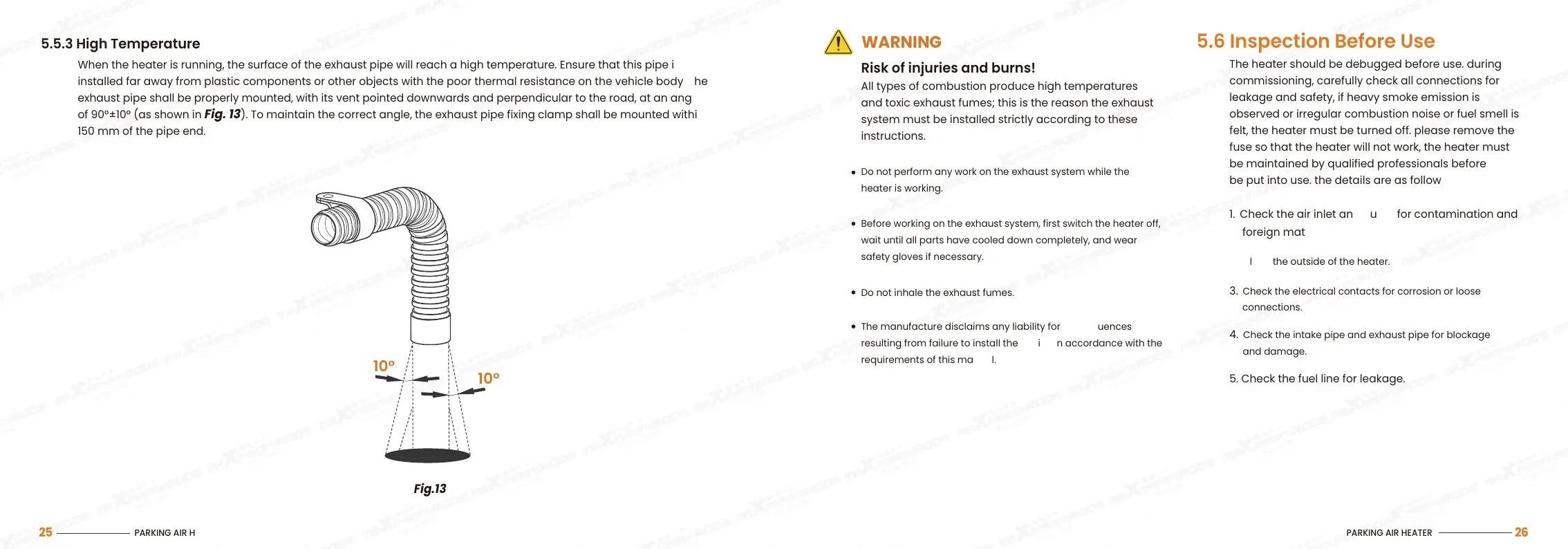 When the heater is running, the surface of the exhaust pipe will reach a high temperature. Ensure that this pipe is